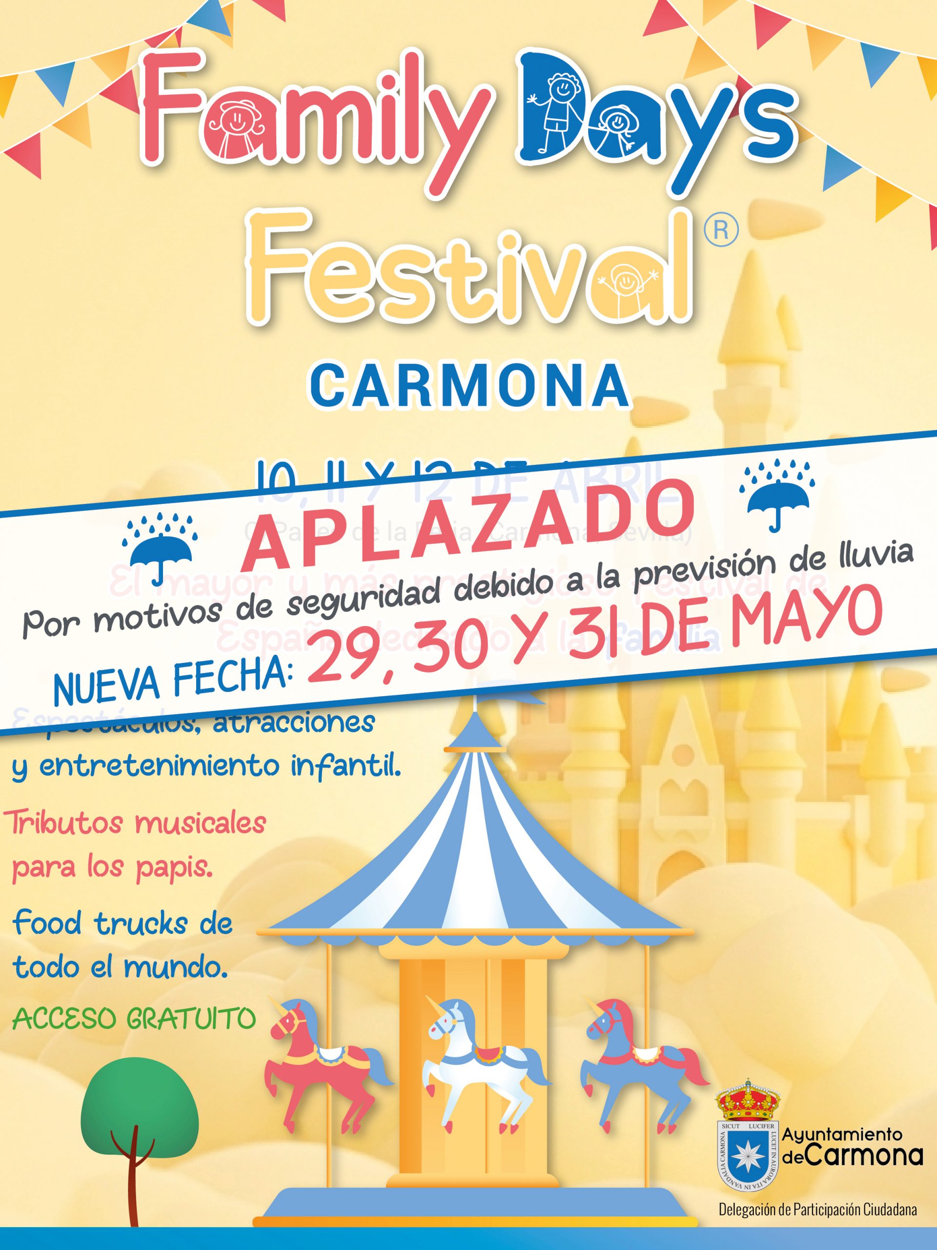 Debido a la previsión de lluvia para este finde, nos vemos obligados a aplazar el Family Days Festival Carmona 2026. ¡Anotad las nuevas fechas!